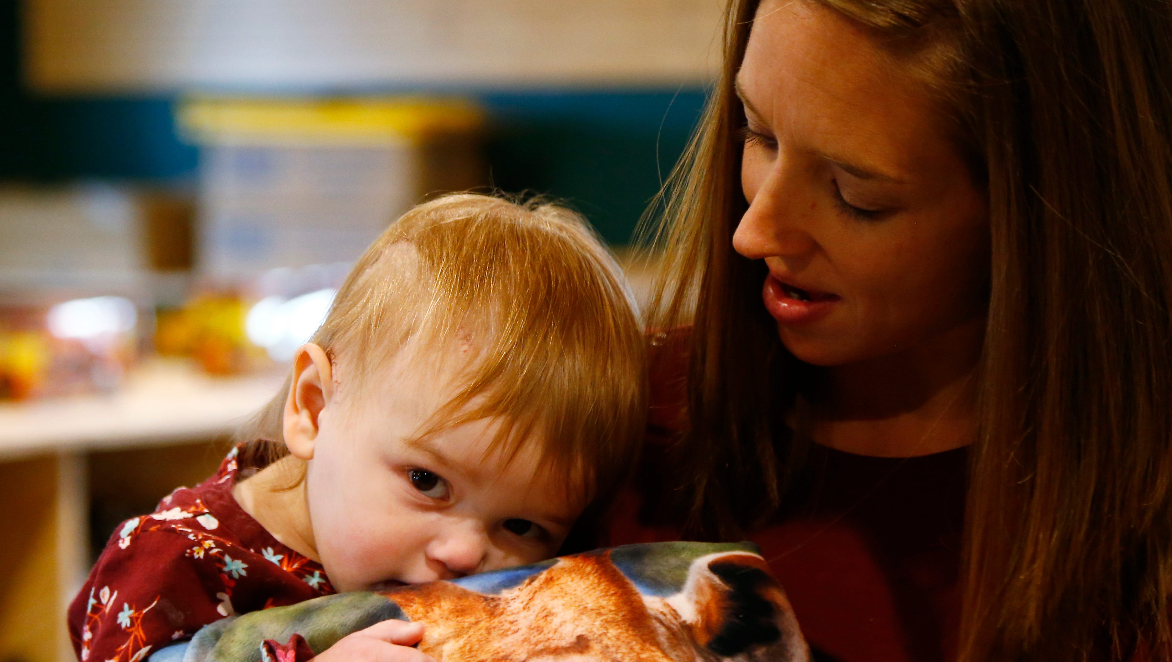 She's loud and excitable, every bit the almost-2-year-sometime. Merely the long scar beneath her pilus that curves effectually her head, and the fainter one beneath information technology, are clues to the ordeal this little daughter has endured.